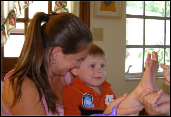 Tanya gets a little help tickling Jayce, Beth's little guy.