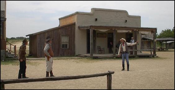 Reenactment of a gunfight performed for visitors to the Alamo Village - with a touch of comedy added.