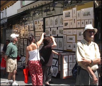 Alleyway lined on both sides with works by local artists and crowed with shoppers.