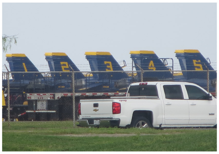 Page 1: We came back for doctor appointments and ended up having many more than we expected. But it is all good. Two more at the end of the month and we will return to Boerne. The Blue Angels were on base for an air show that we missed - but got to see them practice. We did some driving around town to see what has changed - and what hasn't. At the mall, we bumped into an old friend from Gerry's CNATRA days, Patsy. Nice surprise! We've seen Glen and Jinny from Beeville, and met them and Leon and Hilda in Sinton and stopped by to see George. Staying on base means that the golf course is VERY convenient. Although Terry has not been up to playing again yet, she has driven the cart for Gerry.